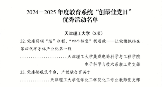 近日,在天津市教育系统2024-2025年度“创最佳党日”优秀活动评选中,我校推荐的集成电路科学与工程学院电子科学与技术系教工党支部“党建引领‘芯’征程 ‘四个转变’提质效——让党旗飘扬在第四代半导体产业化第一线”、化学化工学院化工专业教师党支部“党建领航筑平台,产教融合育英才”2项主题党日活动被评为2024-2025年度教育系统“创最佳党日”优秀活动。